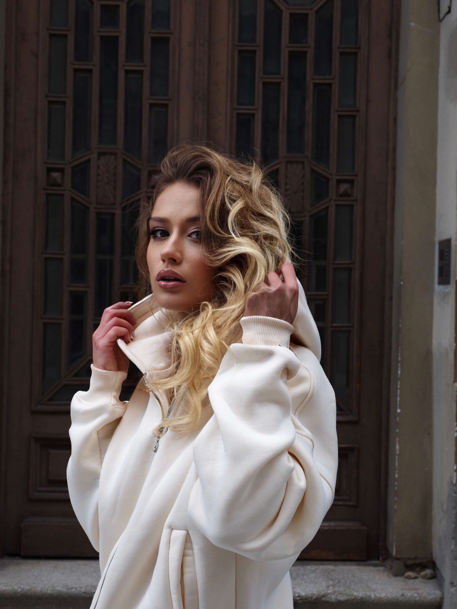 Šis modelis SPECIALIAI KURTAS NEŠIOTI po paltais ar striukėmis – rankovės ir pečių linija suformuotos taip, kad džemperis nesikauptų ir nevaržytų judesių. Pilnas užtrauktukas leidžia patogiai reguliuoti, kaip nori jį nešioti – užsegtą ar atsegtą. Rankogaliai ir apačia su elastinėmis juostomis padeda išlaikyti formą. Audinys storas, su pūkeliu viduje, malonus odai ir gerai laikantis formą net po daugelio skalbimų.